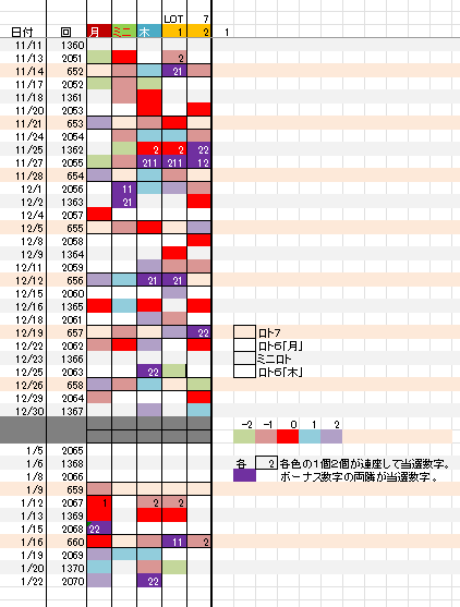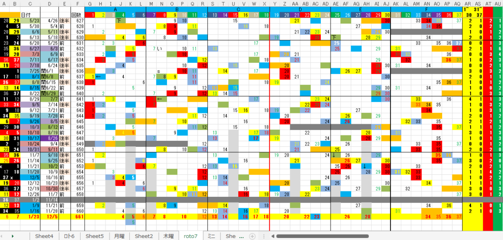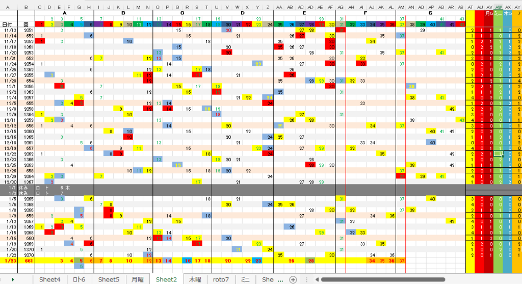 1/23 ロト7第661回予想アシストPARTⅠI 未分類 Twitter Facebook はてブ Pocket LINE コピー 2026.01.232026.01.22 広告 ロト7出現表 広告 広告 日付け数字 広告 ボーナス数字 広告 全ロト出現表 広告 ☆ 今回の対象素数は無しです。 広告 ☆ 前回の月Bが【+2】6、木Bが【-2,+2】30、34,となりました。 広告