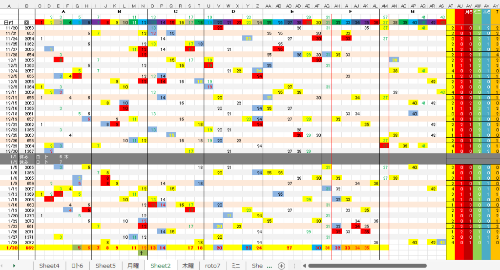 1/30 ロト7第662回予想アシストPARTⅠI 未分類 Twitter Facebook はてブ Pocket LINE コピー 2026.01.302026.01.29 広告 ロト7出現表 広告 広告 日付け数字 広告 ボーナス数字 広告 全ロト出現表 広告 ☆ 今回の対象素数は「43」です。 広告 ☆ 前回の7B①が【-2】18,となりました。 広告 裏技-1.0 近日公開! 広告