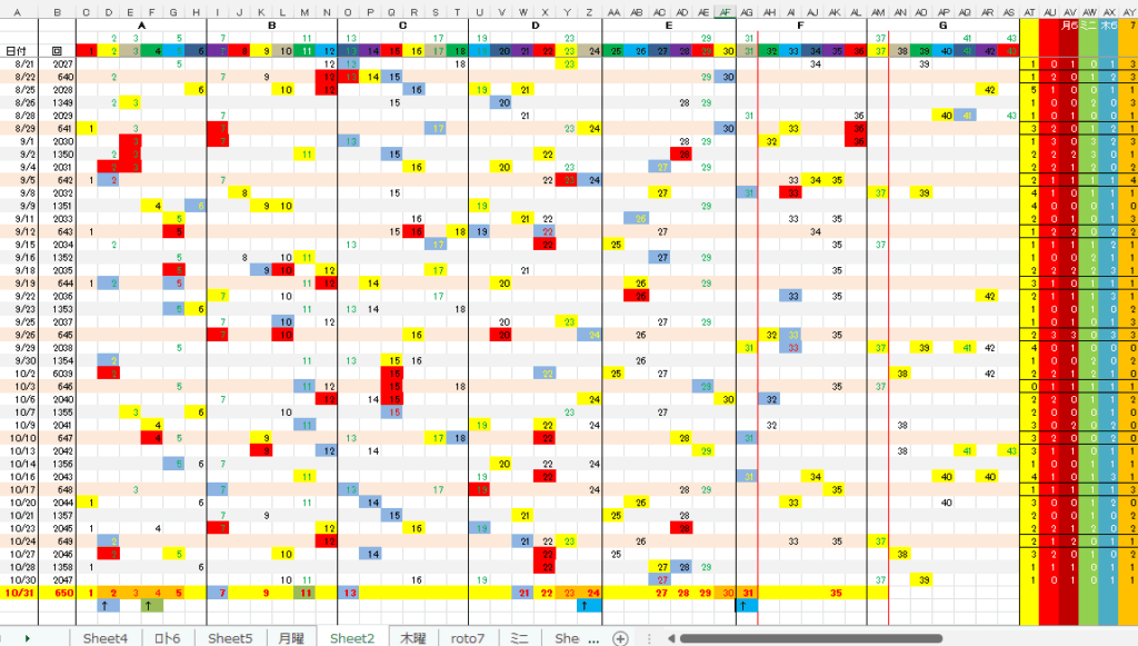 10/31 ロト7第650回予想アシストPARTⅠI 未分類 Twitter Facebook はてブ Pocket LINE コピー 2025.10.312025.10.30 広告 ロト7出現表 広告 広告 日付け数字 広告 ボーナス数字 全ロト出現表 広告 ☆ 今回の対象素数は「11」「19」「37」です。 広告 ☆ 前回の月Bが【+2】16、木Bが【0】19,7B➁が【-2】19,となりました。 広告
