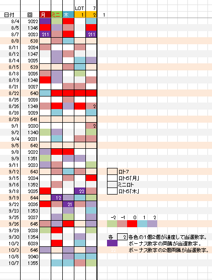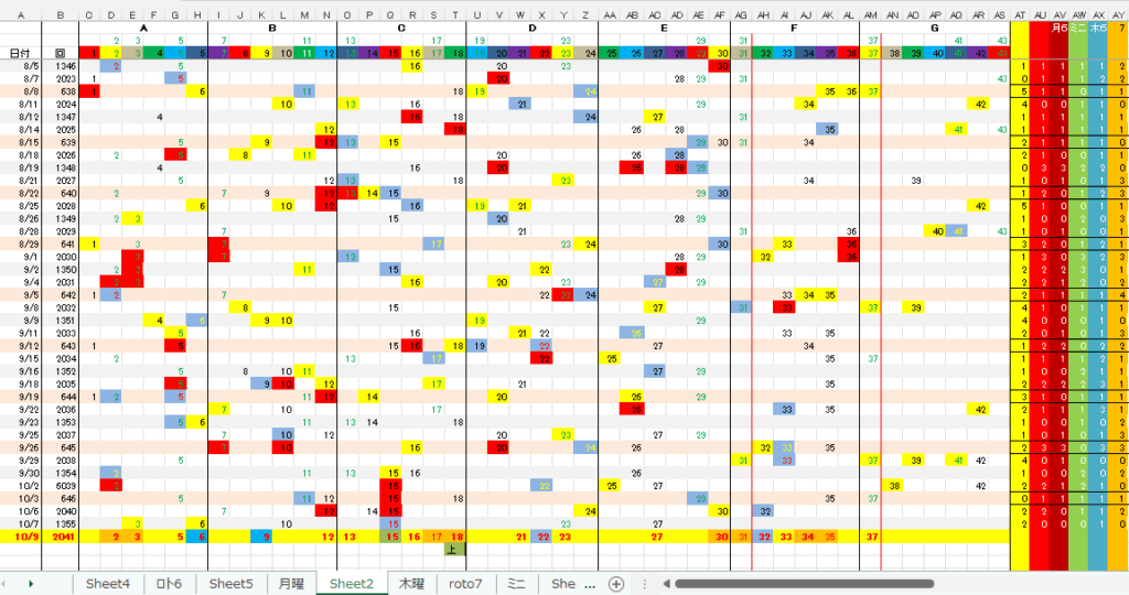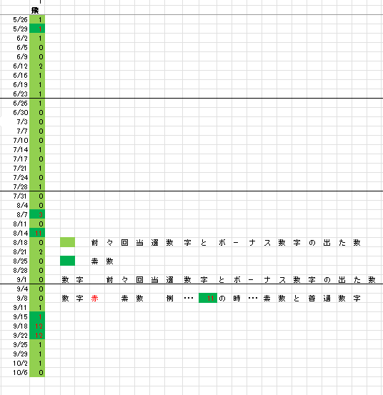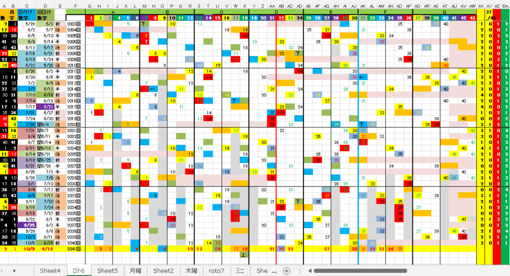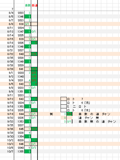 10/9 ロト6「木」第2041回予想アシスト「裏技公開中!」 未分類 Twitter Facebook はてブ Pocket LINE コピー 2025.10.08 広告 ロト6出現表 広告 広告 日付け数字 広告 ボーナス数字 広告 全ロト出現表 広告 ☆ 今回の対象素数は「3」「23」です。 広告 広告 ☆ 前回のミニBが【+1】3、木Bが【+1】23,7B①が【-1】10,7B➁【-2】27,となりました。 広告