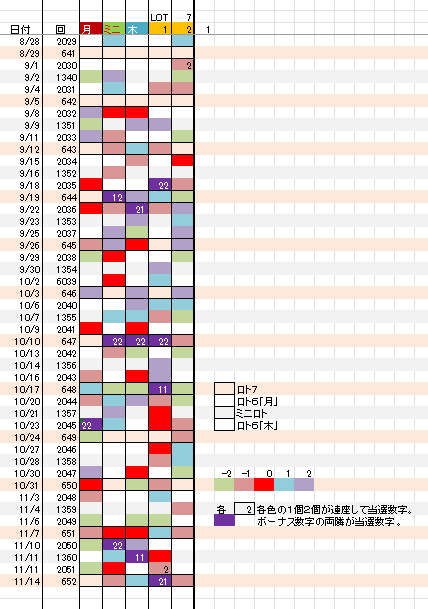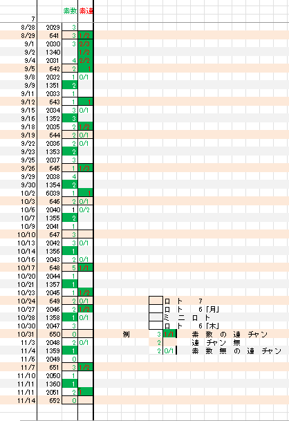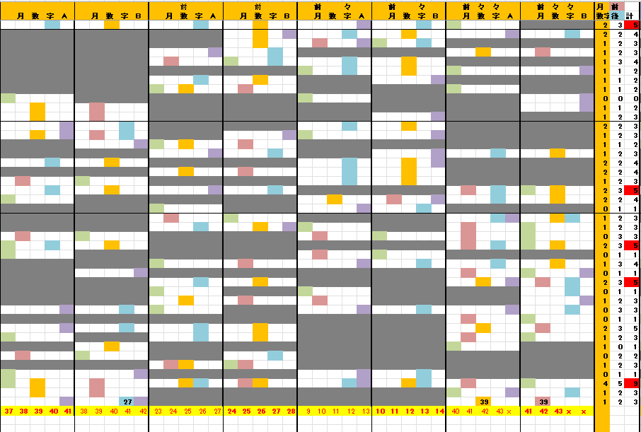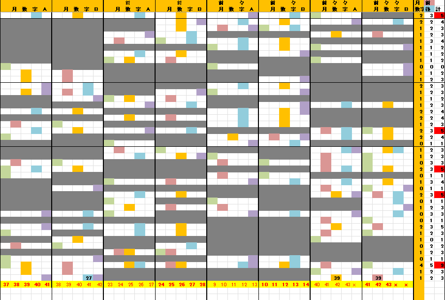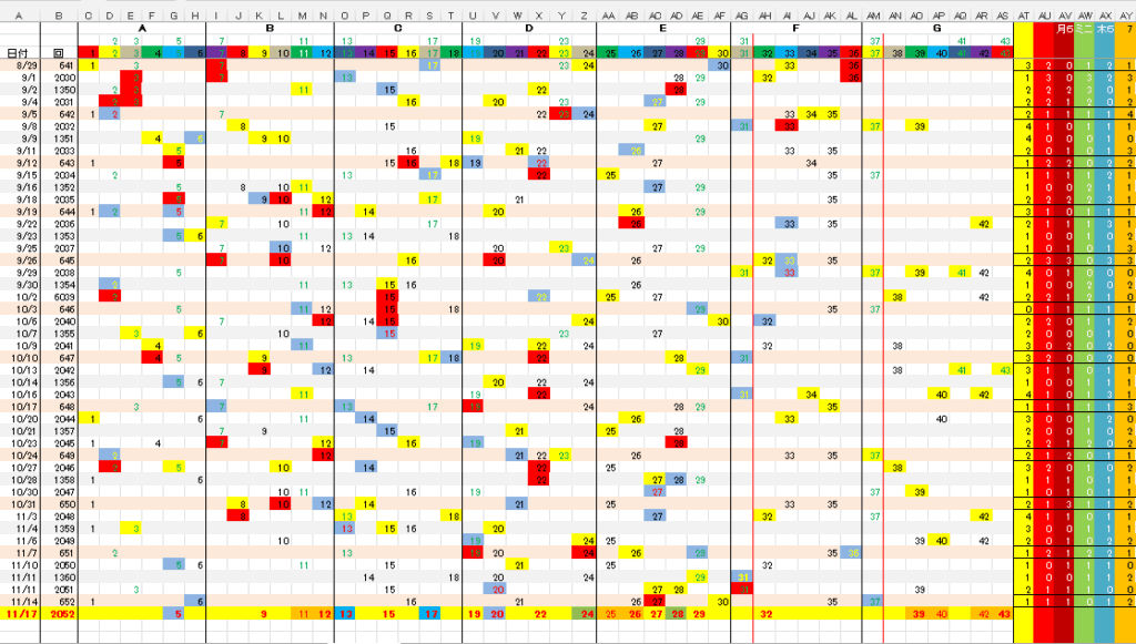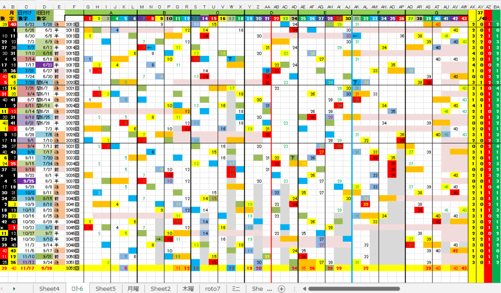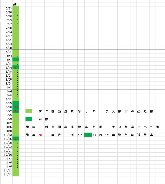 11/17 ロト6「月」第2052回予想アシスト「裏技公開中!」 未分類 Twitter Facebook はてブ Pocket LINE コピー 2025.11.16 広告 ロト6出現表 広告 日付け数字 広告 ボーナス数字 広告 全ロト出現表 広告 ☆ 今回の対象素数は「37」です。 広告 ☆ 前々回の当選数字は最高で3個、たまに2個、それ以外では1個か0個ですので毎回削除数字にしても高額当選を狙うことができます。43個のうち7個、削除数字にできれば確率が高くなります。 広告 ☆ 前回のミニBが【-1】30,木Bが【+1】21,7B①【-2,+1】27,30,7B➁が【-1】35,となりました。裏技5関連数字だけで4個当選しました。 広告 広告